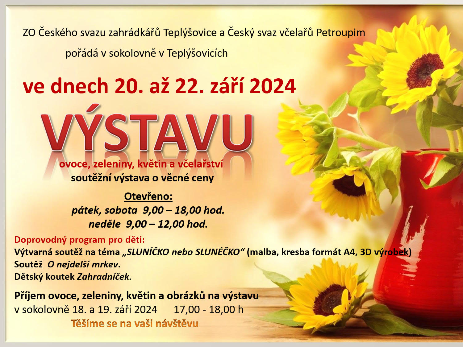 zahrádkáři Teplýšovice a včelaři se sídlem v Petroupimi srdečně zvou na společnou výstavu, která se koná v sokolovně v Teplýšovicích ve dnech 20. až 22.září 2024
