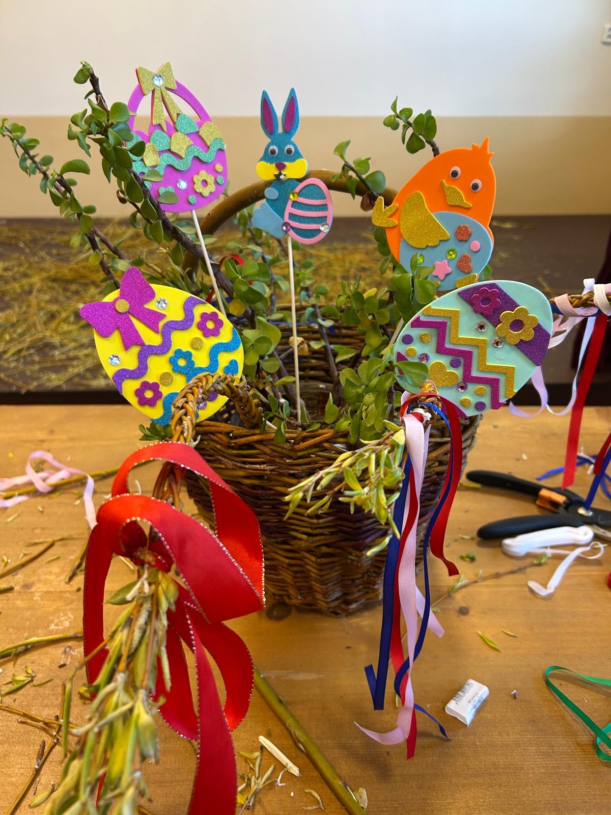 Na prvním bylo zdobení velikonočních perníčků pomocí barevných tubiček. U druhého stolečku si děti mohly vyškrábat magnetu. U třetího stolečku se vyráběly dekorace z papíru. U dalšího stolečku se tvořily pěnové zápichy v podobě kuřátek, vajíček, beránků či zajíčků. Dále si děti mohly ubrouskouvou technikou ozdobit dřevěnou mističku, do které si poté zasely řeřichu. Na šestém místě byla výroba závěsné dekorace - plůtku s kuřátkem nebo zajíčkem dle vlastního vkusu. Samozřejmě nemohlo na velikonočních dílnách chybět pletení pomlázky z osmi proutků, kterou si pak mohly děti ozdobit barevnými pentlemi.
