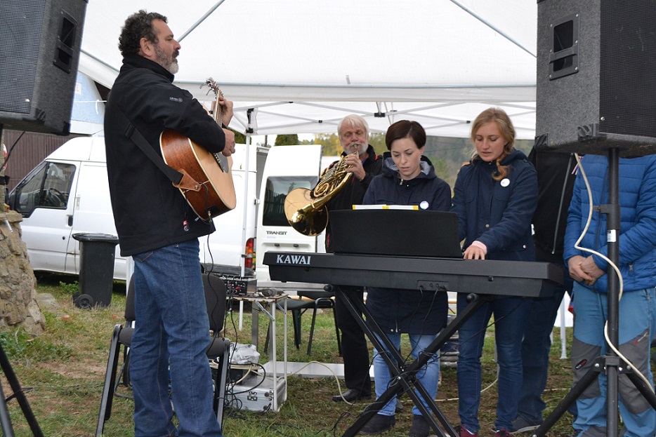 Následovalo krátké hudební pásmo, kdy jsme si za doprovodu kláves (Martina Vaňková, Tereza Grafnetterová), kytary (Dan Dvořák) a lesního rohu (Stanislav Bílek) zazpívali českou hymnu a píseň „Ach synku, synku“.